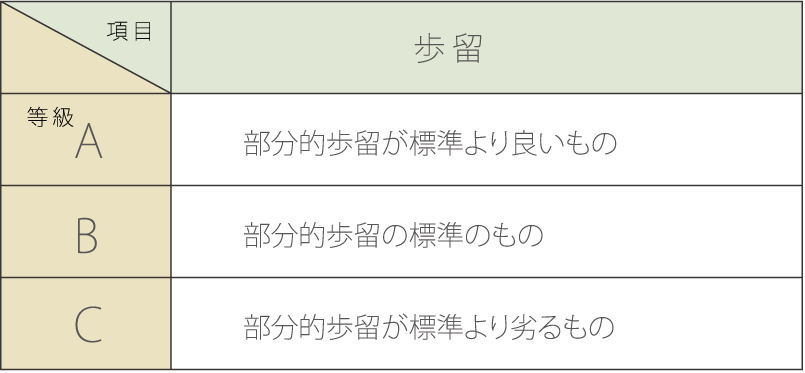牛肉の品質・価格の指標となるのが格付け(等級)。 格付けは、「歩留等級」と「肉質等級」とがあり、「歩留等級」は「A」標準より良いもの、 「B」標準的なもの、「C」標準より劣るものの3等級に分かれている。「肉質等級」は、「脂肪交雑」、「肉の色沢」、 「肉の締まりおよびきめ」並びに「脂肪の色沢と質」の4項目。各項目の部位はいずれも第6~第7肋骨間切開面総合判定される。 「肉質等級」の判定は5段階評価で決定され、最高は5。つまり、「歩留等級」と「肉質等級」から判定された、 最高格付けは、A5というわけだ。なお、この基準は外見だけのもので、その牛の血統などは審査基準には含まれない。